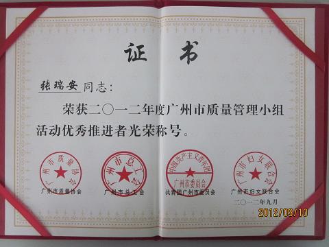 9月6日,我司參加2012年度廣州質量管理小組及質量信得過班組活動表彰大會,我司取得豐厚成績。該活動由廣州市質量協會主辦,我司每年都能取得優異成績,今年更是連奪三個大獎,在公司榮譽上增添一筆光彩。以下為獲獎信息: