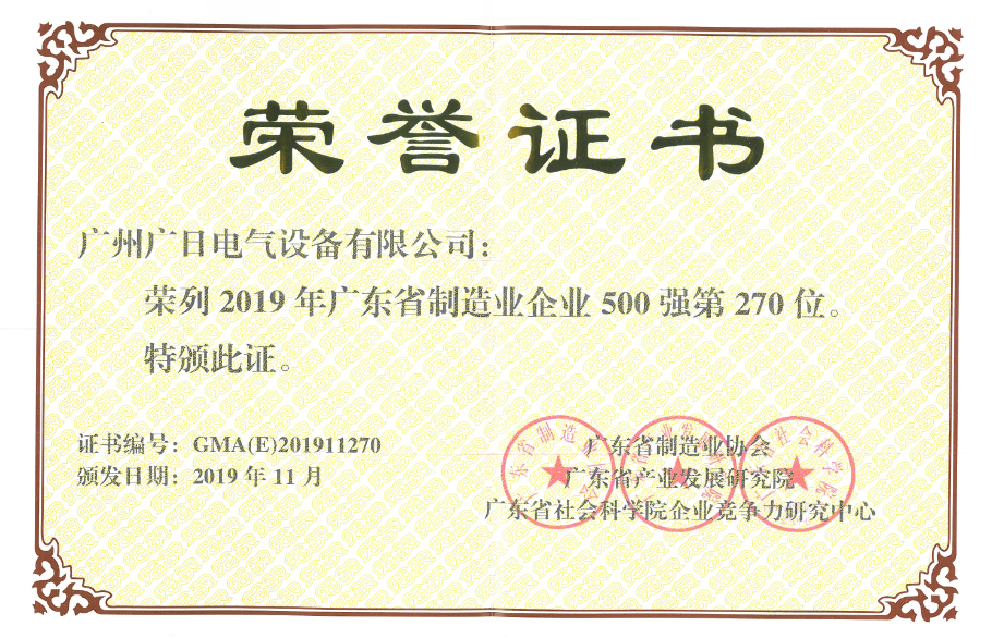 廣日電氣憑借夯實(shí)的制造實(shí)力,榮登“廣東省制造業(yè)500強(qiáng)”榜單,位列第270位,較2018年上升2位。