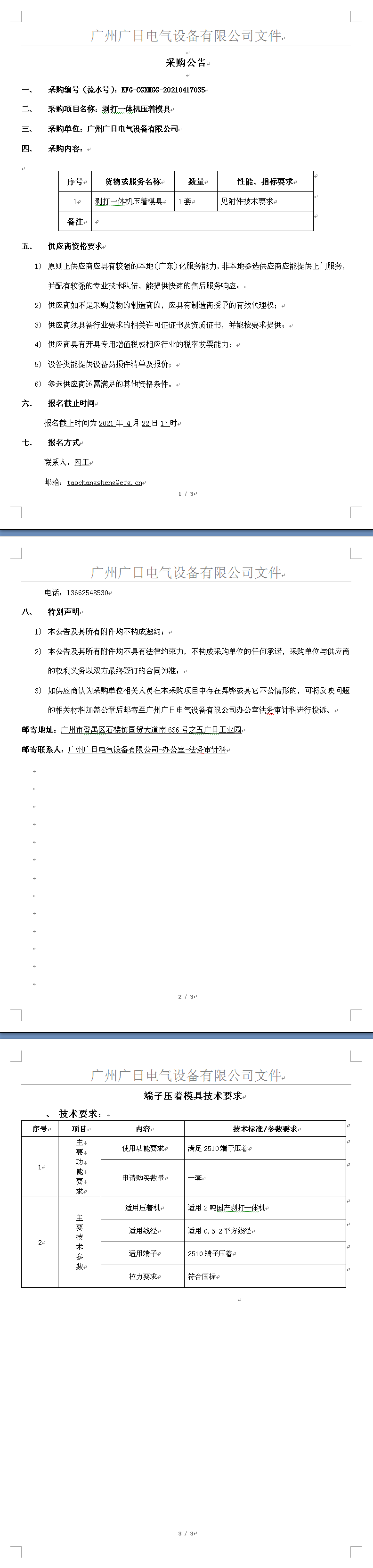 剝打一體機壓著模具采購公告