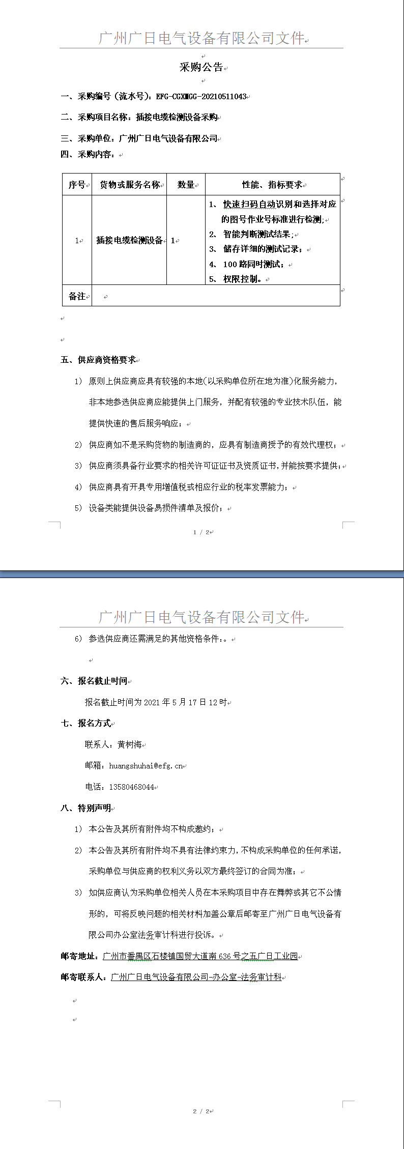 插接電纜檢測設備采購公告