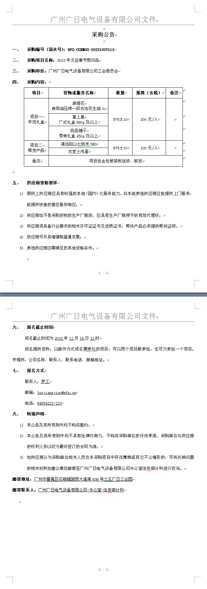 2023年元旦春節慰問品采購公告