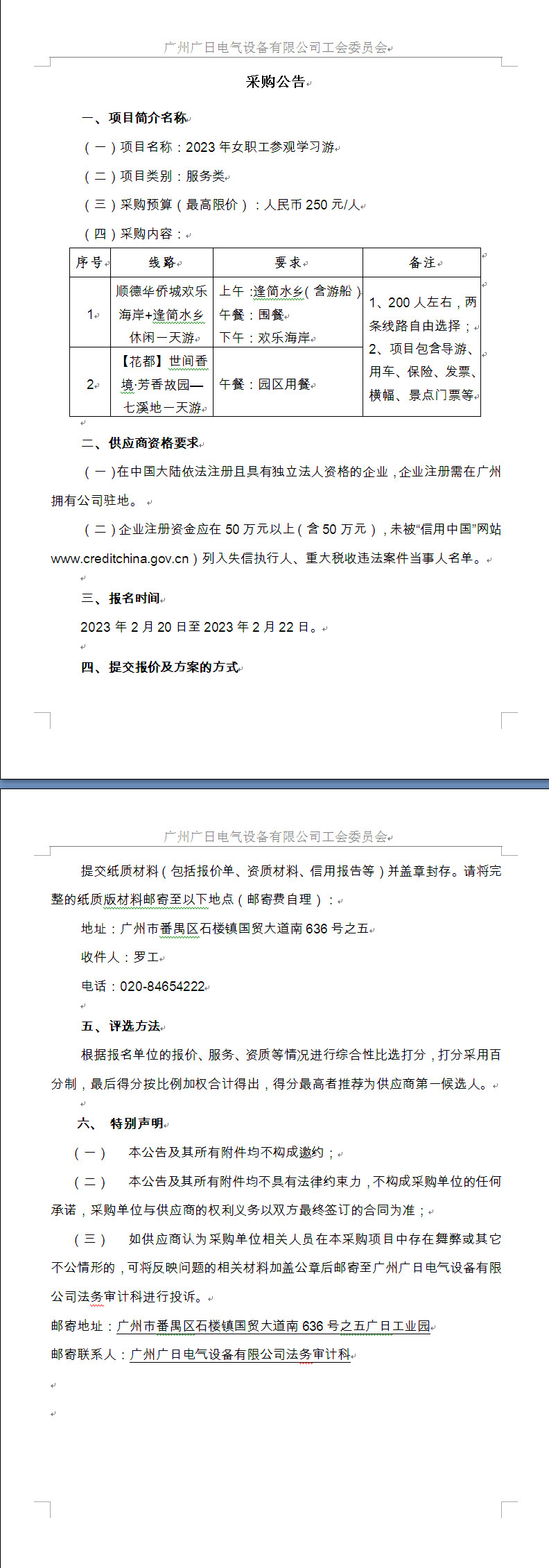2023年女職工參觀學習游采購公告