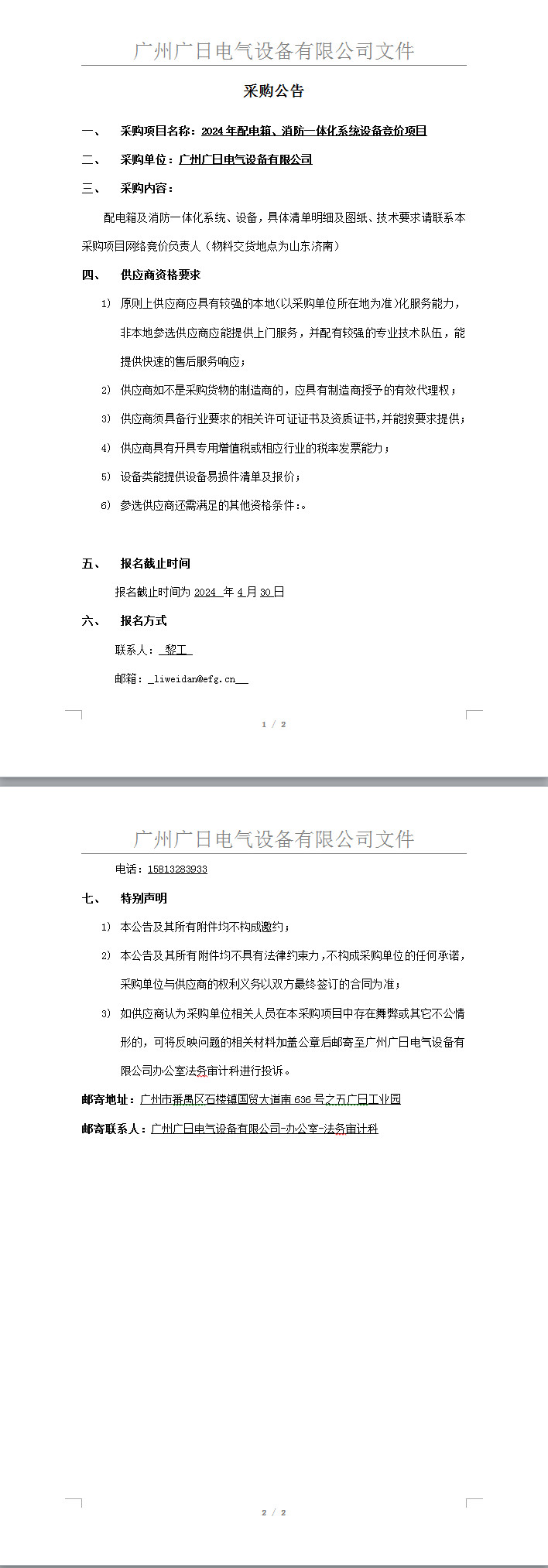 2024年配電箱、消防一體化系統設備競價項目