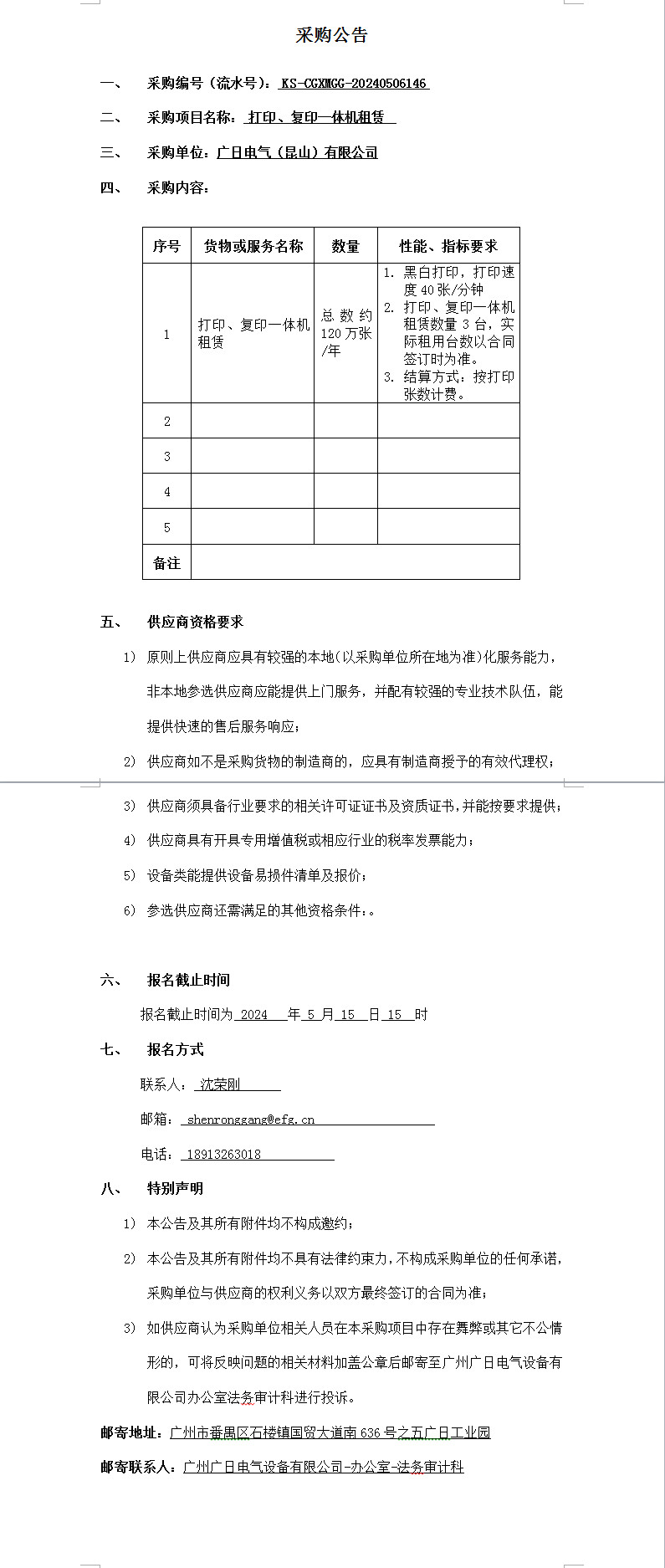 打印、復印一體機租賃公告