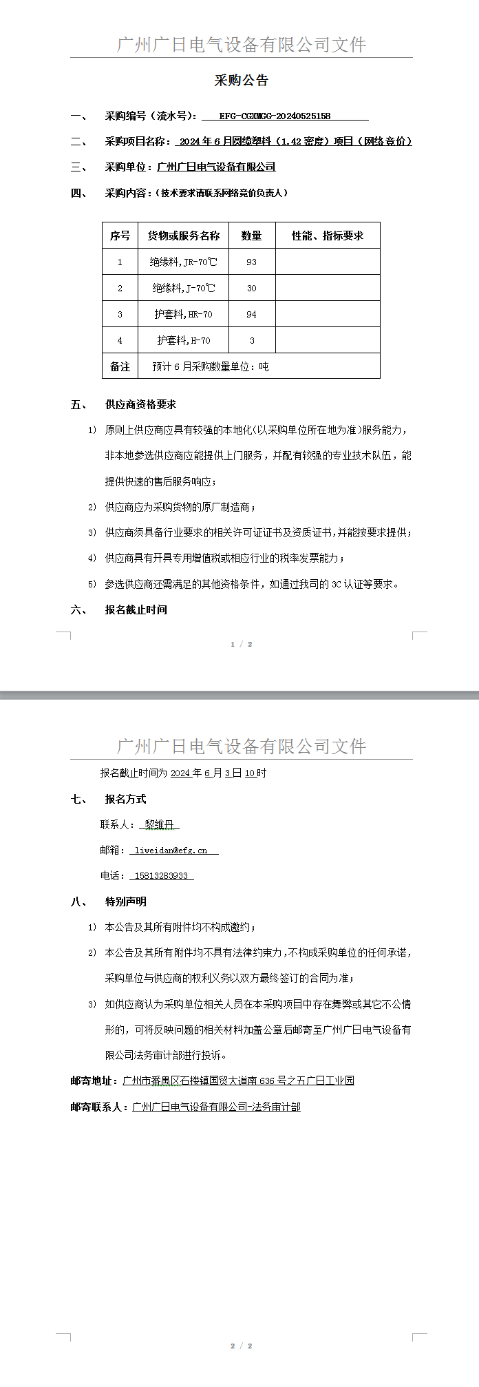 2024年6月份圓纜塑料(1.42密度)項目(網絡競價)