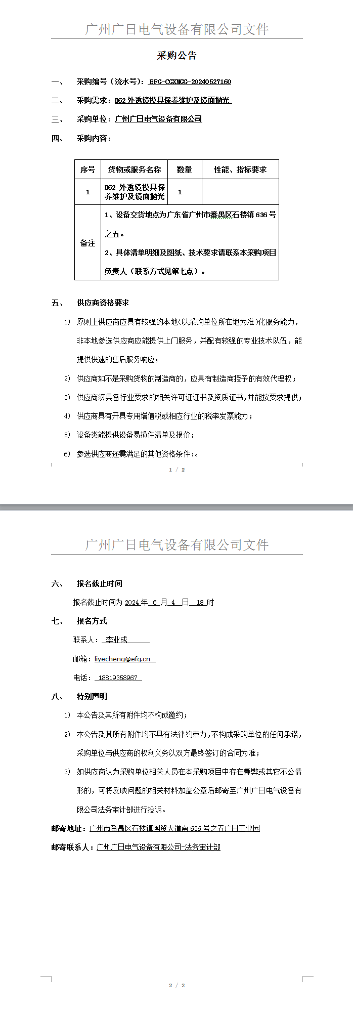 廣州基地光纖激光切割機與模具保養維護及鏡面拋光采購競價