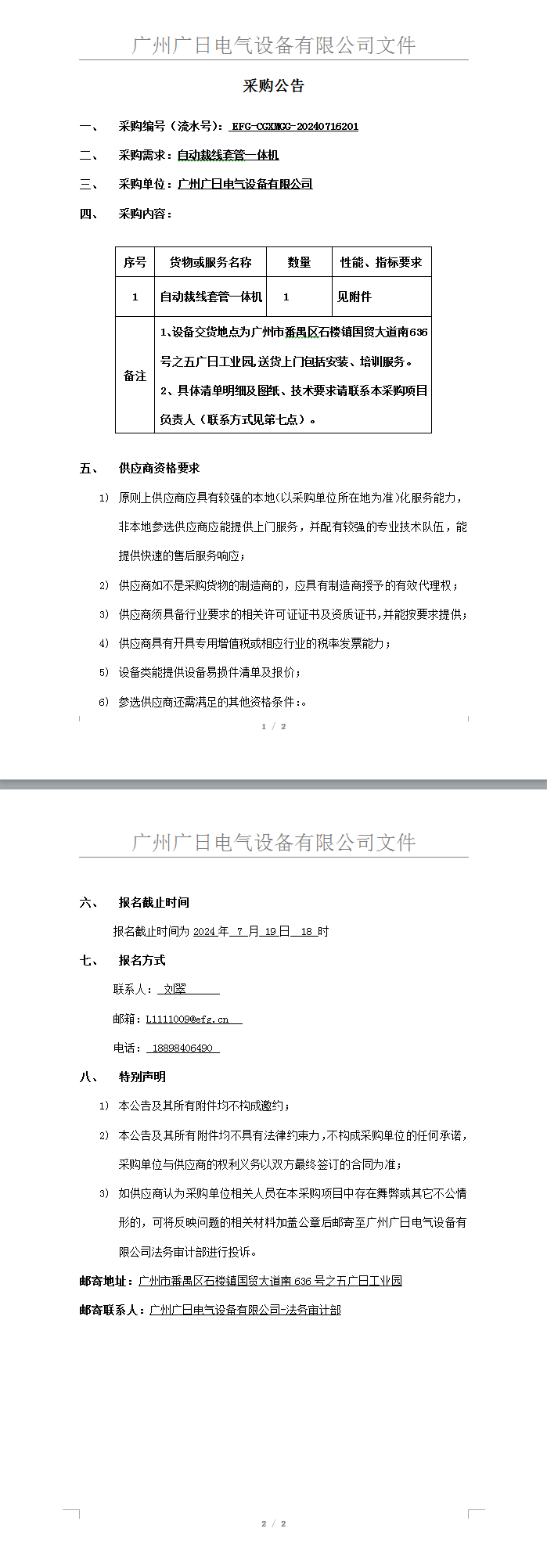 自動裁線套管一體機采購項目