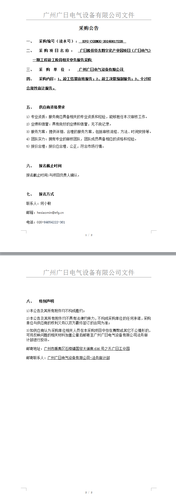 廣日股份華東數字化產業園項目(廣日電氣)一期工程竣工階段相關業務服務采購