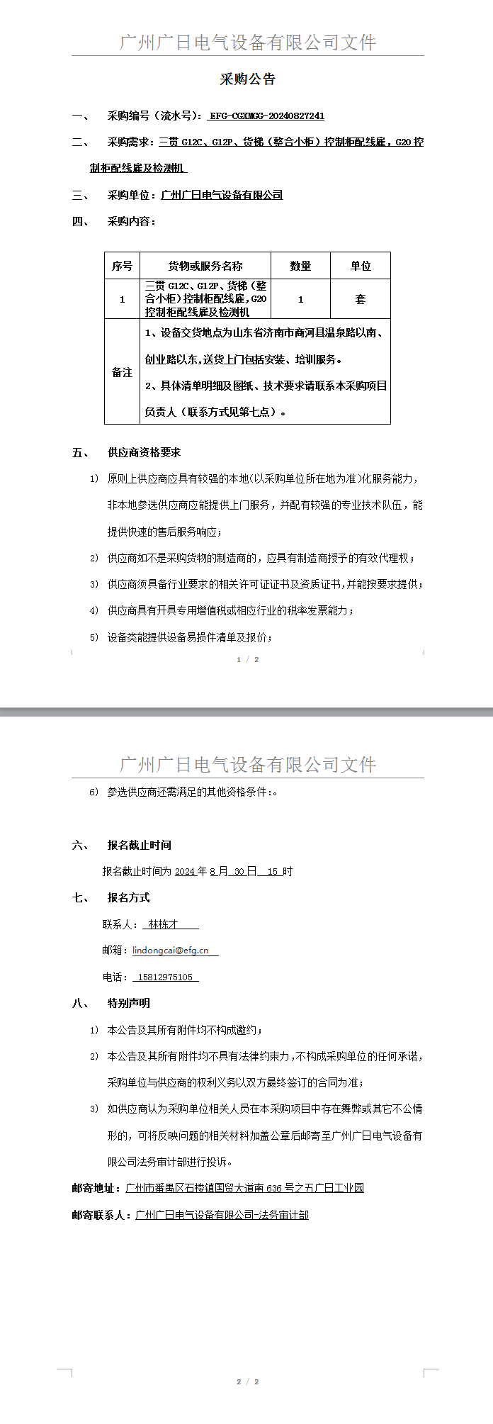 三貫G12C、G12P、貨梯(整合小柜)控制柜配線雇,G20控制柜配線雇及檢測機采購項目