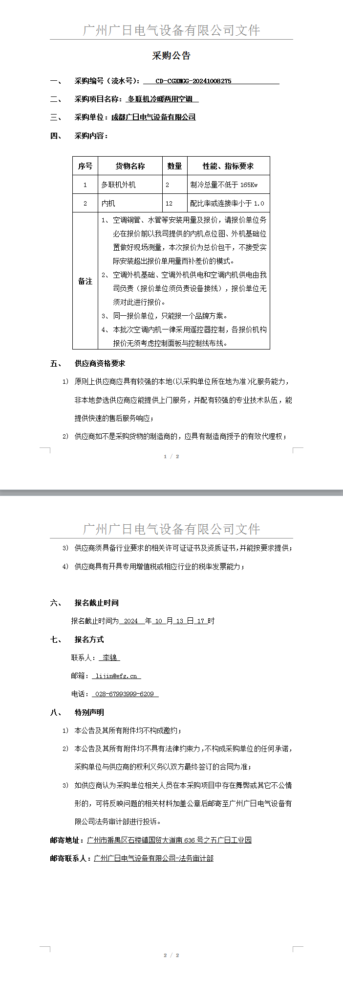 多聯機冷暖兩用空調采購