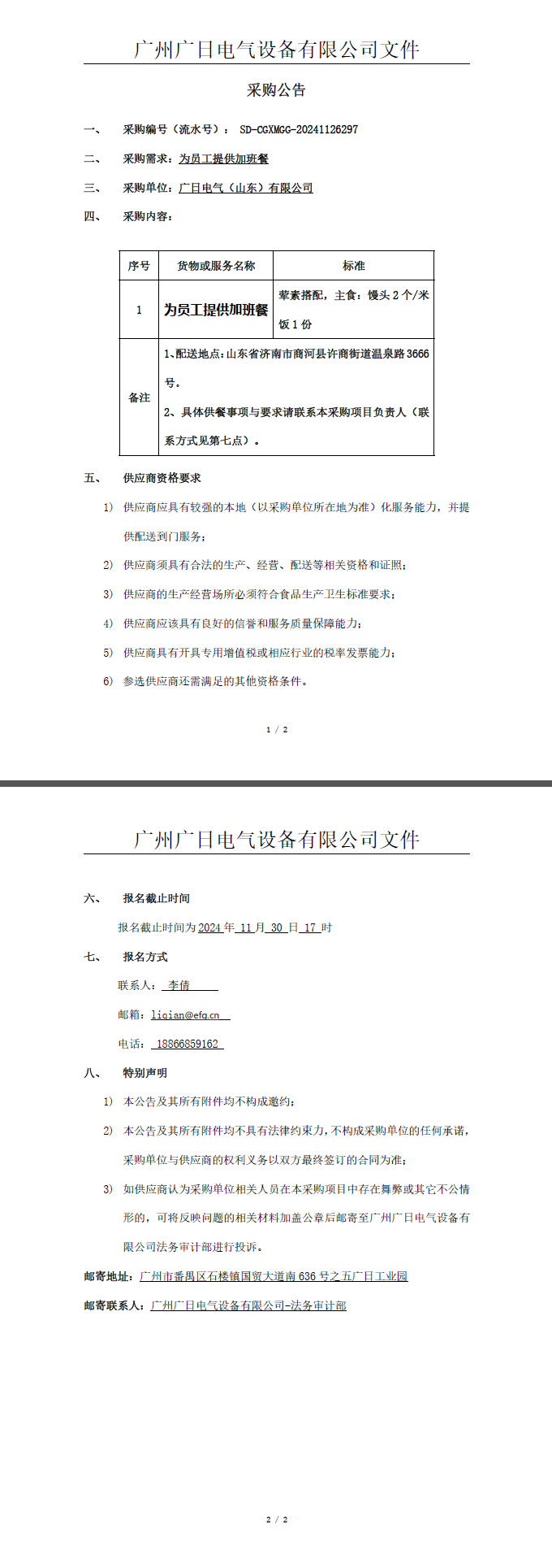 員工加班餐供應項目公告