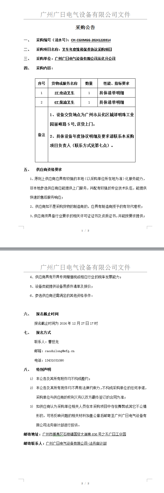 叉車年度維修保養協議采購項目