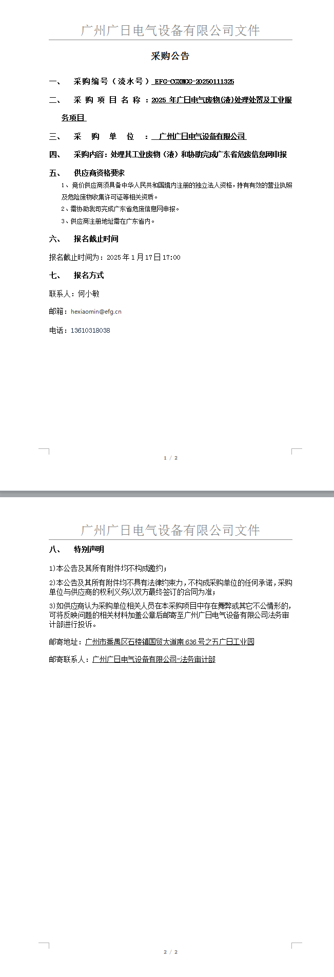 2025年廣日電氣廢物(液)處理處置及工業服務項目