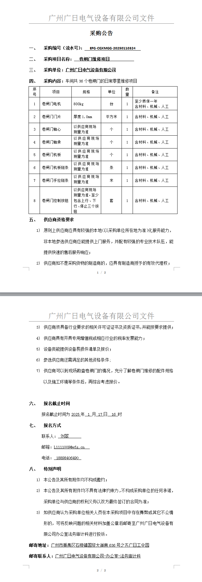 卷閘門維修項目采購項目