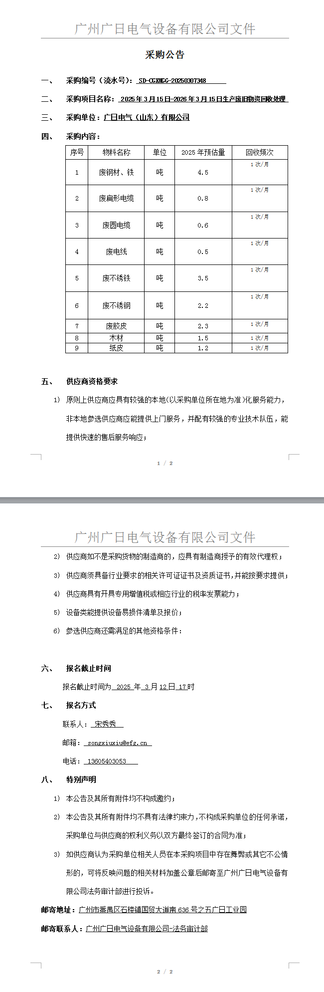 2025年3月15日-2026年3月15日生產廢舊物資回收
