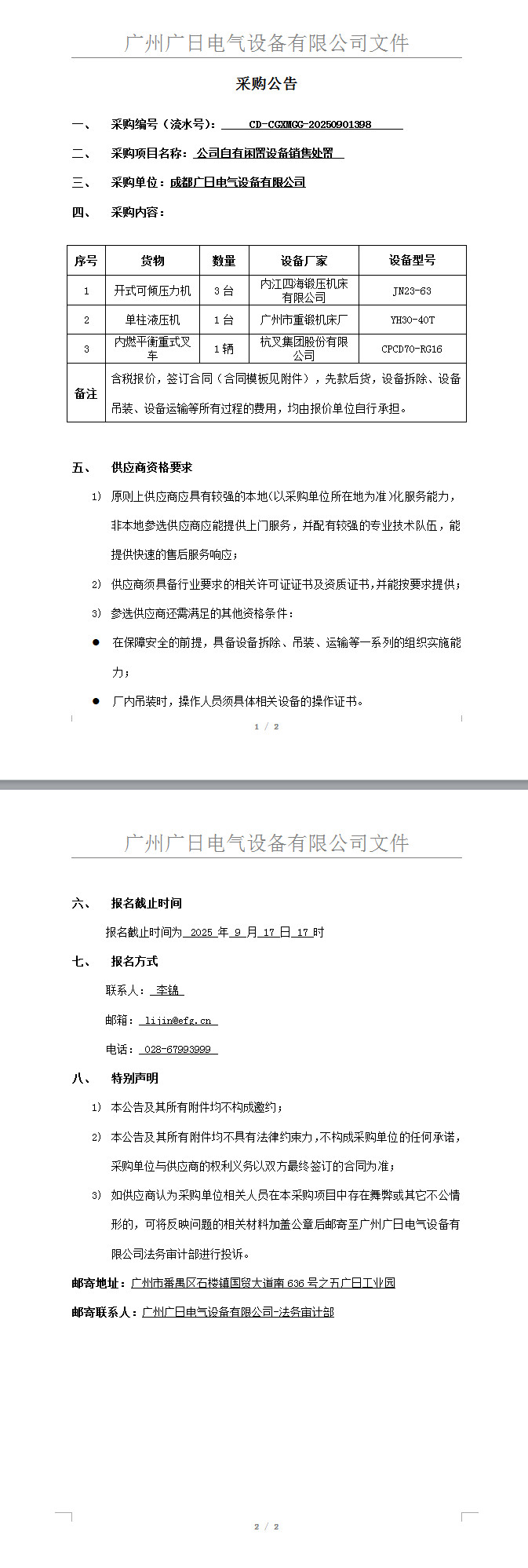 公司自有閑置設備銷售處置
